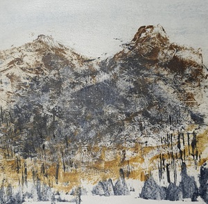 2021Winter in de alpen. Een monoprint gemaakt met acrylverf op papier.